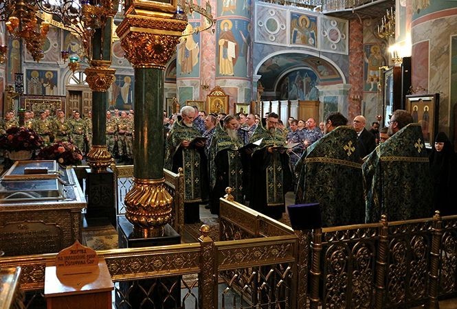 По окончании молебна с акафистом преподобному Серафиму Саровскому духовенство и военнослужащие приложились к мощам святого.