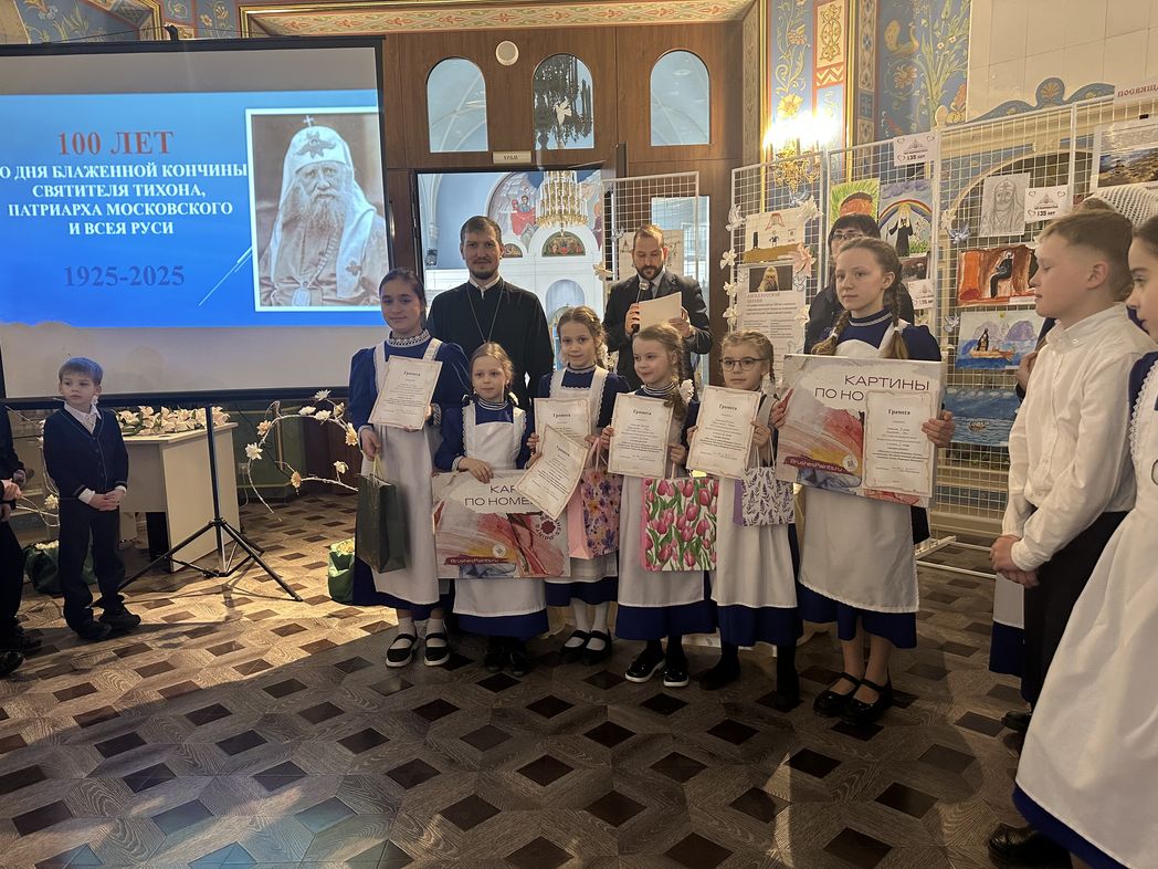 После торжественной части победителям конкурса рисунков, посвященных Патриарху Тихону, были вручены грамоты и дипломы. Учащиеся старших классов вместе с духовником школы посмотрели и обсудили документальный фильм, посвященный святителю.