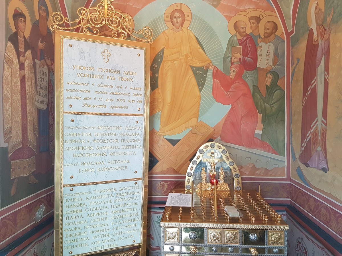 18 мая 1609 года Толгский монастырь подвергся жестокому испытанию — отряд поляков захватил обитель, осквернил и разграбил ее. Сорок шесть иноков, скрывшихся в храме, были перебиты. Их братскую могилу долгое время отмечал «раздвоенный» камень, и богомольцы брали сквозь его отверстие могильную землю, веруя, что она обладает целебной силой. Память 46 иноков толгские сестры чтут до сих пор. Ежегодно в день их памяти совершается панихида в храме-часовне, который ныне прекрасно украшен фресками. Кроме того, ежедневно об упокоении их душ сестры молятся за Литургией, на панихидах и трапезах. В летнее время года ежедневно панихиды проходят в часовне Мучеников.