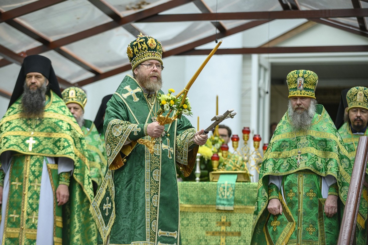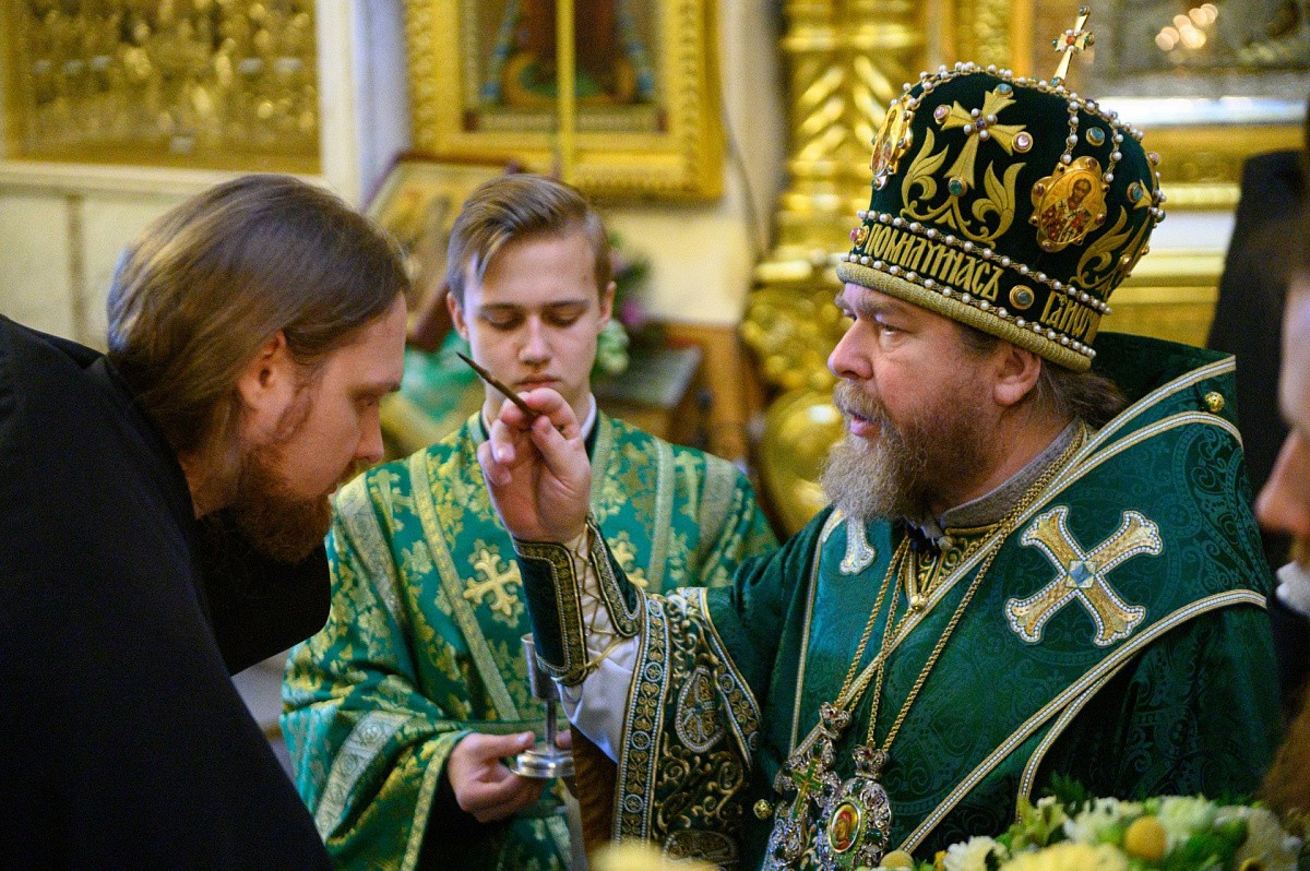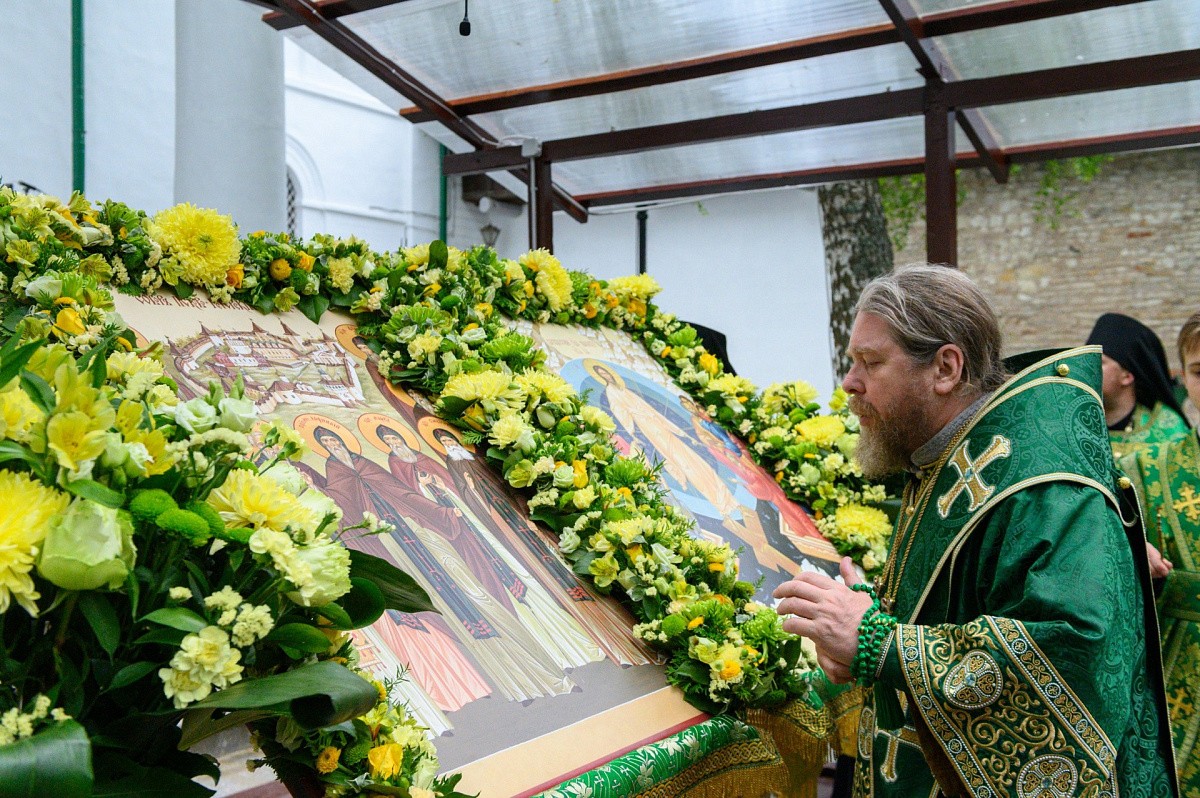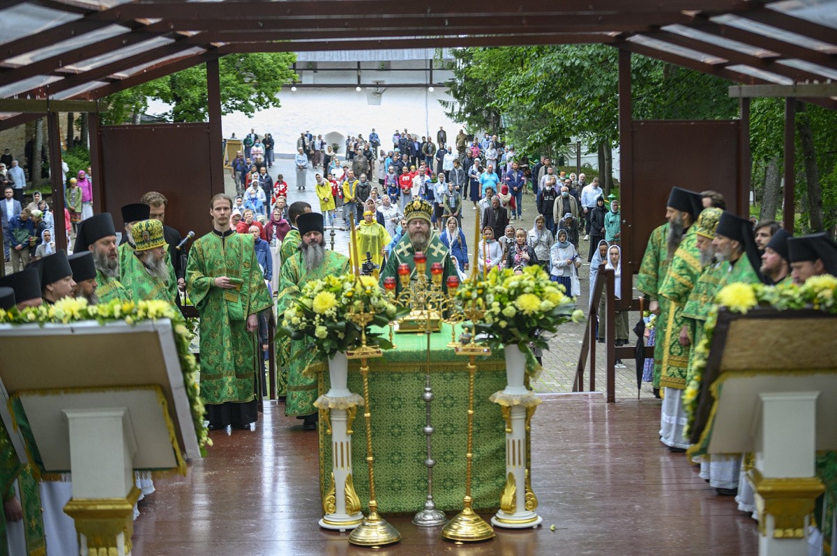 В сам праздничный день за Литургией главе Псковской митрополии сослужили наместник Благовещенской Никандровой пустыни архимандрит Спиридон (Иващенко), исполняющий обязанности наместника Иоанно-Богословского Савво-Крыпецкого монастыря иеромонах Всеволод (Сиканов), благочинный Псково-Печерской обители иеромонах Прохор (Андрейчук) с братией в священном сане.