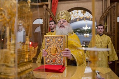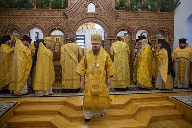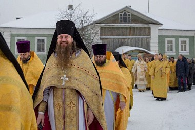 По окончании Литургии духовенство и миряне проследовали крестным ходом в Казанский собор обители, где у мощей святителя Феофана был совершен молебен.
