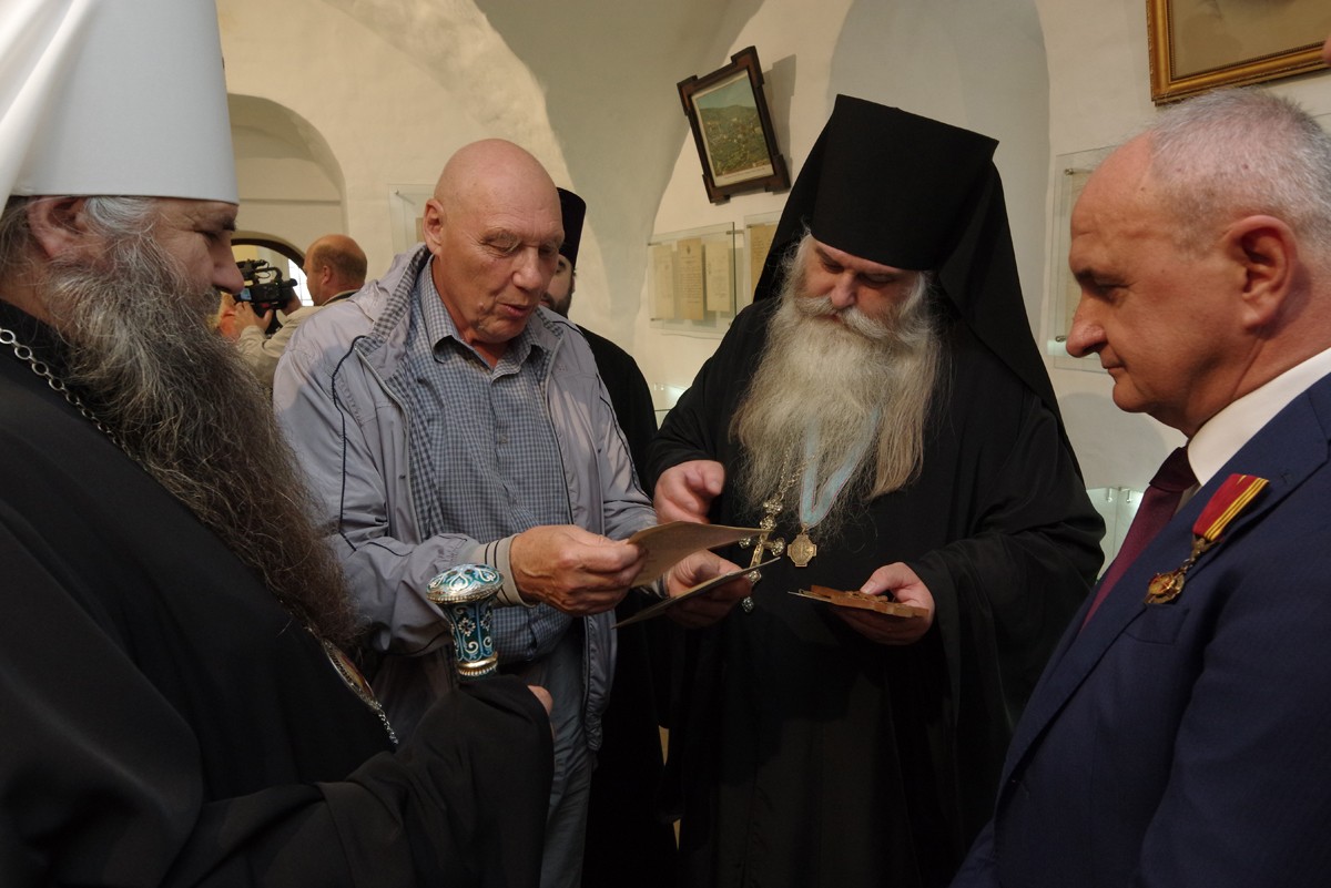 Архимандрит Тихон, выступая на церемонии, рассказал, как два года назад по благословению правящего архиерея начал создаваться музей, как собирались уникальные экспонаты. Настоятель Печерской обители поблагодарил владыку и преподнес ему в дар небольшой бюст императора Александра I.