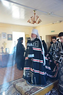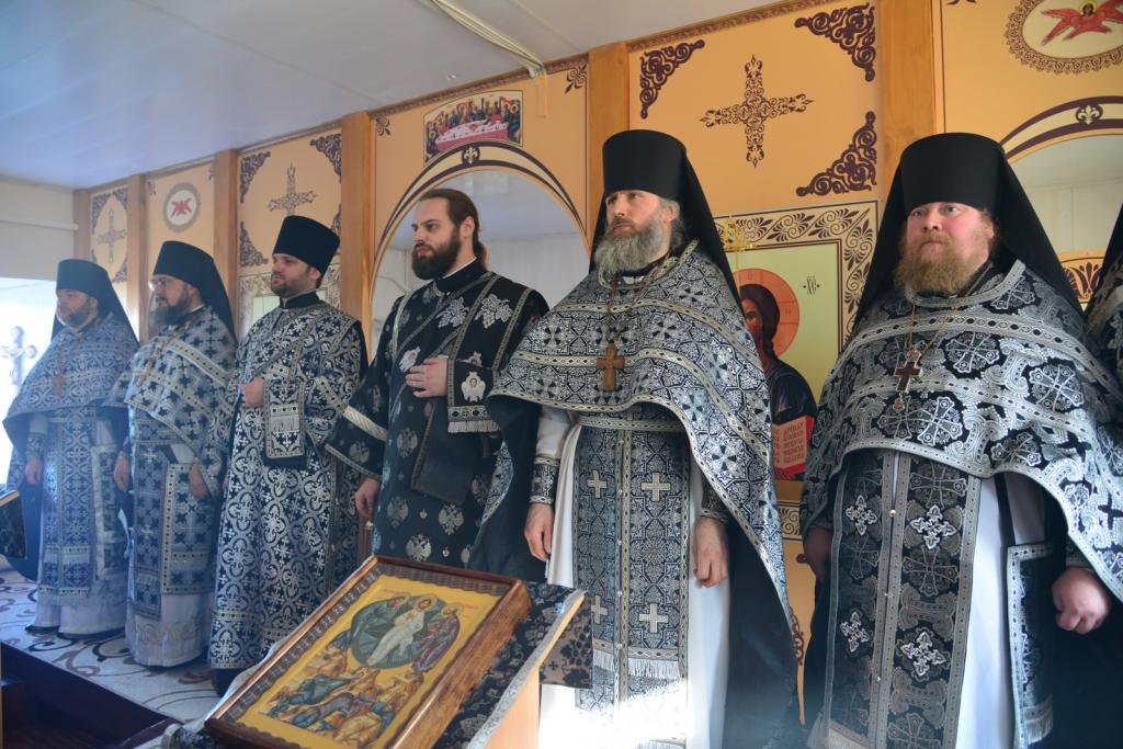 Его Высокопреосвященству сослужили благочинный монастырей Брянской епархии игумен Даниил (Цупиков), наместник Свенского Успенского монастыря игумен Алексий (Тюрин), настоятель Бело-Бережской Иоанно-Предтеченской пустыни игумен Глеб (Шматов), настоятель Богородицкой Площанской пустыни игумен Леонид (Лушкин), и.о. настоятеля Карачевского Воскресенского монастыря иеромонах Алексий (Долгачев), насельник Богородицкой Площанской пустыни иеромонах Иоанн (Скабара).