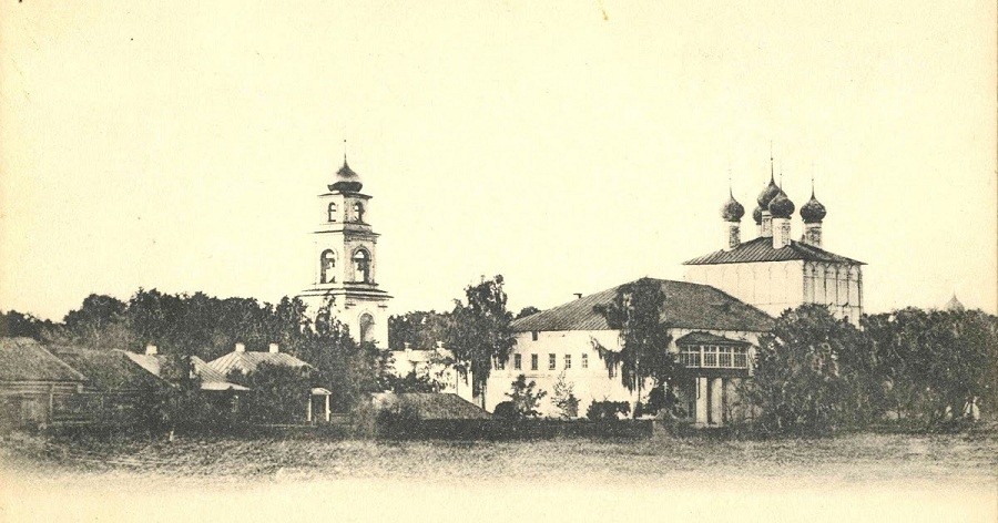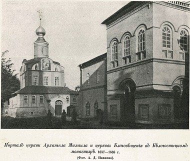 Известно, что Белогостицкий мужской монастырь был основан на левом берегу реки Вёксы в начале XV века архиепископом Ростовским Григорием. Название монастыря связывают с легендой об охоте в этих местах князя Кия, основателя Киева, жившего в белом шатре и прозванного «белым гостем». Особой известности монастырь достиг, когда его архимандритом в 1630–1646 годах стал Иона Сысоевич, впоследствии всесильный митрополит Ростовский. В середине XVII века обитель была обнесена каменной оградой с четырьмя башнями. Основу ансамбля составляли два стоящих рядом храма, построенных в 1657–1658 годах. Самую главную святыню монастыря представляла чудотворная икона Казанской Божией Матери. Эта икона прежде была домовою у князя Михаила Темкина. В Благовещенском соборе Белогостицкого монастыря под церковью находился подклет с пятью каменными гробницами рода князя Ростовского Михаила Темкина, благотворителя этой обители.