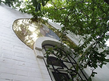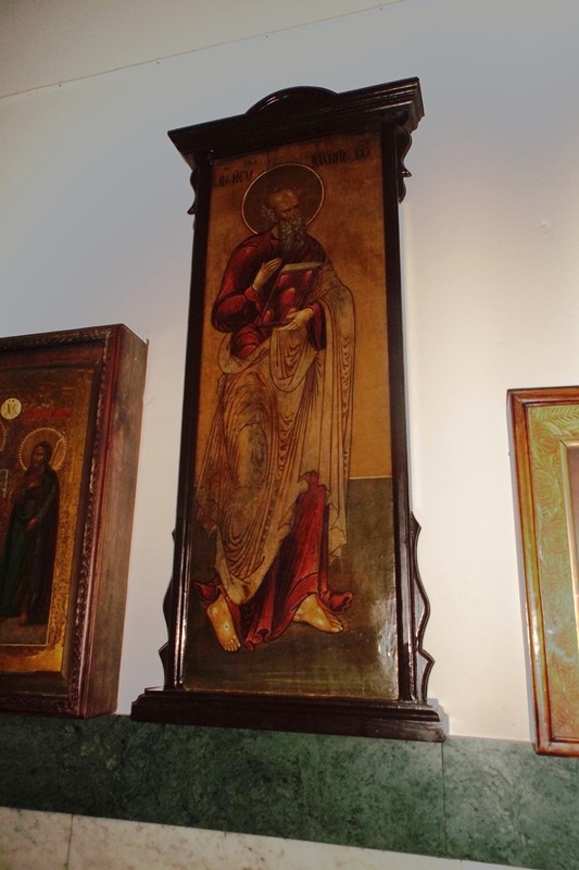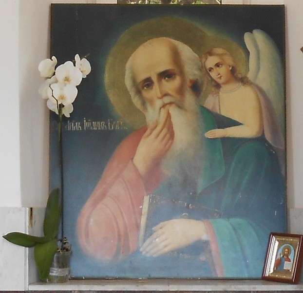 Апостол Иоанн Богослов символически изображен в виде льва по правую руку от Спасителя на Голгофе, которую написал для монастыря иконописец Валерий Поляков.