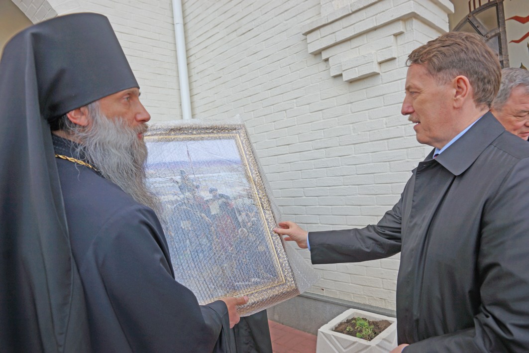 В завершение высоким гостям архимандрит Тихон подарил картины репродукций фрагментов полотна «Великое стояние на Угре 1480 года», календари монастыря и пригласил в будущем всех посетить также и святую обитель.