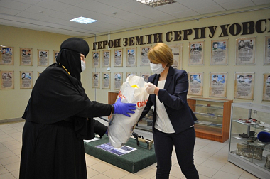 Настоятельница Владычного Введенского женского монастыря игумения Алексия (Петрова) передала главе г. о. Серпухов Юлии Купецкой многоразовые маски, которые помогут обезопасить врачей, медицинских сестер, сотрудников больниц и поликлиник, работающих в период пандемии, а также их получат пожилые люди и дети.