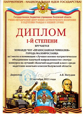 Из Калуги участники военно-патриотического клуба в честь святителя Николая привезли диплом 1-й степени. В начале были сомнения – можно ли допустить на конкурс военно-патриотический клуб, у которого занятия по военной подготовке проводятся лишь раз в неделю, так как остальные ребята занимаются чаще – у них ежедневные построения, и должна быть лучше подготовка в остальном. К участию в смотре казаков-кадетов из Малоярославца допустили посмотреть, что они из себя представляют. И ребята показали себя лучшим образом. Все старательно готовились, в том числе к конкурсу по стрельбе из пневматической винтовки. Также готовились к конкурсу выступлений с казачьей пляской и песней. Раньше танцевали только девочки – как участницы младшего состава хореографического ансамбля «Отрада». Итог смотра конкурса – диплом 1-й степени. Правда не военно-патриотическому клубу, а команде ЧОУ «Православная гимназия» при Свято-Никольском Черноостровском женском монастыре в городе Малоярославце, так как смотр проходил среди команд от классов, и в номинации «Лучшее военно-патриотическое объединение казачьей направленности и признание. Однако самое главное – не просто диплом, главный результат – это признание, что высокий уровень подготовки можно получить не только в специализированном кадетском классе, но и в таком объединении как военно-патриотический клуб организованный под покровом монастыря.