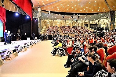 Зрительный зал был заполнен детьми из Москвы и близлежащих регионов, в том числе детьми-инвалидами, многие из которых получили подарки из рук самого Патриарха.