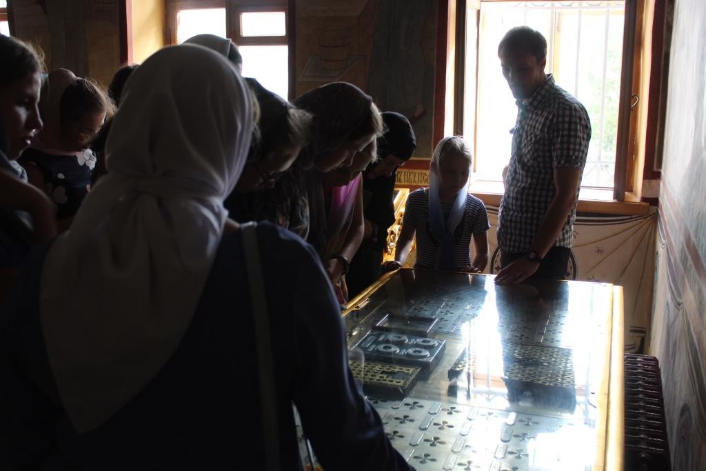 На экскурсии по Лавре, при посещении Успенского собора, юным паломницам больше всего запомнился рассказ о преподобном Максиме Греке, о судьбе святогорского монаха в России. Возложив цветы к могилам старцев – схиархимандрита Кирилла (Павлова) и архимандрита Наума (Байбородина), они направились на Лаврскую колокольню, послушали рассказ об уникальном колоколе «Лебедь» с удивительным чистым звоном, созданном во времена Бориса Годунова накануне смуты и тяжелой осады монастыря. В программе были также посещение Трапезного и семинарского Покровского храмов, где можно было спеть пасхальный тропарь, радостное настроение которого так соответствовало духу поездки. А пасхальные стихиры прозвучали уже на лаврском кладбище в Деулино на могиле схиархимандрита Михаила (Балаева), которого некоторые из воспитанниц пансиона помнят еще живым. Прибрав могилу и украсив ее цветами, девочки спели литию, завершив ее напоминанием о Воскресении и победе над смертью. Перед отъездом из Сергиева Посада удалось прогуляться в парке у лаврских стен, покормить уток и лебедей, покачаться на качелях, – ведь под конец каникул хотелось еще отдохнуть и порадоваться лету и хорошей погоде.
