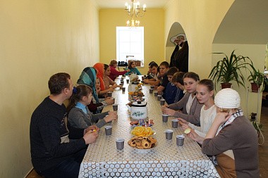 Праздник продолжился в недавно отремонтированном трапезном корпусе Вознесенского монастыря. Ребятам-инвалидам, родителям, волонтерам, духовенству было предложено чаепитие. На средства, собранные во время проведения акции «Белый цветок», детям и подросткам с ограниченными возможностями были вручены Святое Евангелие и подарки.