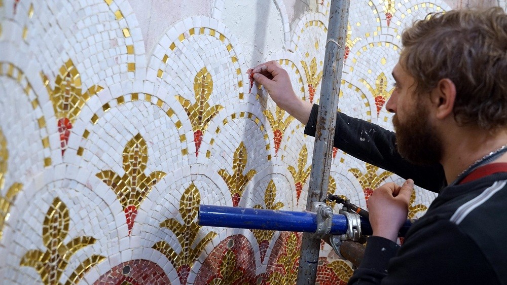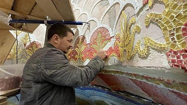 Специалисты монтируют изображение Святого Духа в виде голубя под куполом, завершен ряд орнаментального украшения, которое выполняется по всему храму.