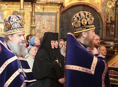 За Литургией молились: Заместитель Председателя Синодального отдела по монастырям и монашеству, настоятельница Зачатьевского ставропигиального женского монастыря игумения Иулиания (Каледа) с сестрами; наместник Заиконоспасского ставропигиального мужского монастыря архимандрит Петр (Афанасьев); настоятельница Богородице-Рождественского ставропигиального женского монастыря игумения Викторина (Перминова) с сестрами.