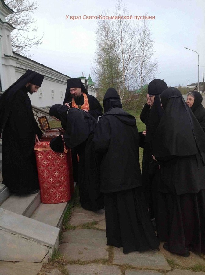 На пути в Верхотурье, паломники сделали краткую остановку у стен Свято-Косьминской мужской пустыни деревни Костылева, где поклонились мощам сибирских святых. Братия пустыни живет по афонскому уставу. Женщины не бывают на территории монастыря, поэтому братия с ковчегом мощей гостеприимно встретили паломниц у стен обители. По просьбе монахинь настоятель монастыря игумен Петр сказал слово назидания о любви ко Христу, которой исполняется сердце человека, пребывающего в молитве наедине с Богом. Игумен говорил о том, как важно уделять молитве хотя бы час времени по пробуждении от сна, когда особенно восприимчивой бывает человеческая душа. Приняв благословение Настоятеля, паломники отправились в Верхотурский Покровский женский монастырь поклониться мощам святого блаженного Косьмы.