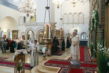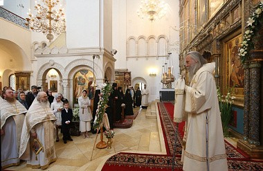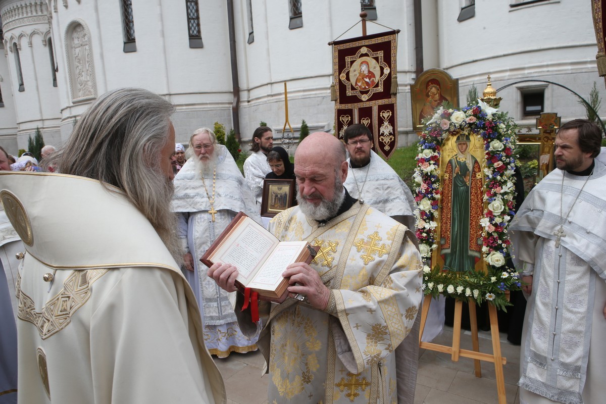 В этот день праздничную Божественную литургию в монастырском соборе Рождества Пресвятой Богородицы возглавил председатель Синодального отдела по монастырям и монашеству архиепископ Сергиево-Посадский Феогност.