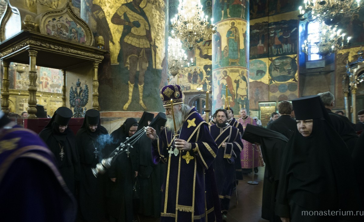 Его Высокопреосвященству сослужили: секретарь Патриарха Московского и всея Руси по городу Москве протопресвитер Владимир Диваков; заместитель председателя Синодального отдела по монастырям и монашеству, настоятель Московского подворья Троице-Сергиевой лавры архимандрит Стефан (Тараканов); наместник Спасо-Преображенского Соловецкого ставропигиального мужского монастыря архимандрит Порфирий (Шутов); наместник Высоко-Петровского ставропигиального мужского монастыря игумен Петр (Еремеев); настоятель Троице-Сергиева Варницкого мужского монастыря игумен Пимен (Артюхов); ризничий Патриарших соборов Московского Кремля протоиерей Вячеслав Шестаков; братия Троице-Сергиевой лавры в священном сане.