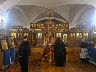 Немногочисленные сестры обители вышли на встречу. Всего в обители восемь насельниц, двоим из них уже за девяносто. Гости из Москвы привезли в дар обители чтимую икону Божией Матери «Милостивая», которую очень ждали в Никольском монастыре и приготовили для образа место в храме, привезли также свечи и предметы первой необходимости. Сестры обители передали им питьевую воду и пироги для насельниц пострадавшего Свято-Успенского Николаевского монастыря Донецкой епархии, куда им предстояло поехать.