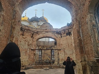 Взору паломниц предстал израненный, местами разрушенный монастырь. Большой белый величественный собор, несмотря на повреждения от обстрелов, продолжает украшать обитель, словно столп, стоящий в центре монастыря. Купола сильно повреждены, в стенах есть пробоины размером с окно. Корпуса все разрушены, часть из них не подлежит восстановлению. Сестры живут в нижнем храме и двух вагончиках.