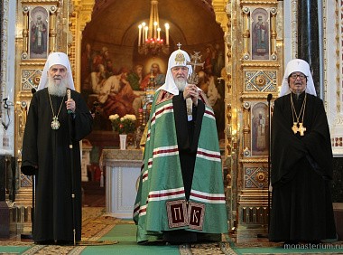 За богослужением пели Патриарший хор Храма Христа Спасителя (регент И.Б. Толкачев) и братский хор Троице-Сергиевой лавры под управлением архимандрита Глеба (Кожевникова).