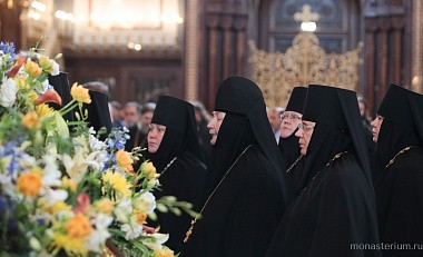От лица монашествующих Русской Православной Церкви с днем тезоименитства Святейшего Патриарха Кирилла поздравил председатель Синодального отдела по монастырям и монашеству, архиепископ Сергиево-Посадский Феогност.