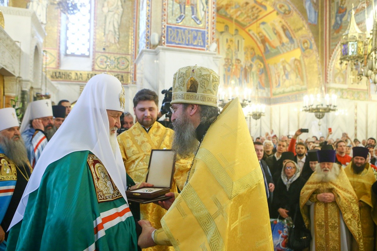 Предстоятель Русской Православной Церкви также поздравил архимандрита Мелхиседека с днем тезоименитства и вручил ему юбилейный крест, изготовленный в память 1000-летия преставления святого равноапостольного великого князя Владимира.