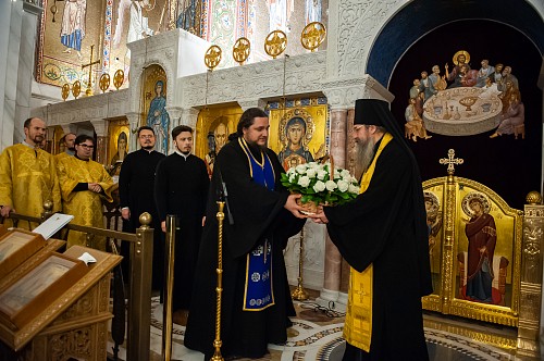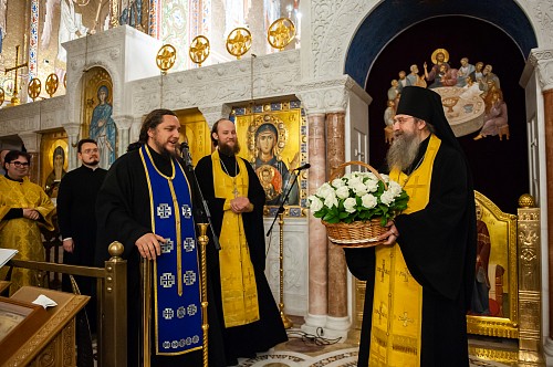 По окончании богослужения клирики Покровского храма поздравили отца настоятеля с тезоименитством. Со словами поздравления от лица клириков и прихожан храма к настоятелю обратился иерей Алексий Ишков. Он торжественно вручил имениннику подарки: богослужебную просфору и букет роз.