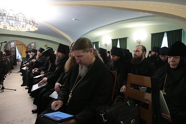 Во вступительном слове архиепископ Феогност передал собравшимся благословение Святейшего Патриарха Московского и всея Руси Кирилла и обозначил две основные задачи работы собрания: подготовка к ХXIV Международным Рождественским чтениям и определение путей взаимодействия Синодального отдела по монастырям и монашеству с епархиальными монастырями.
