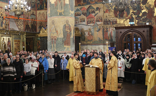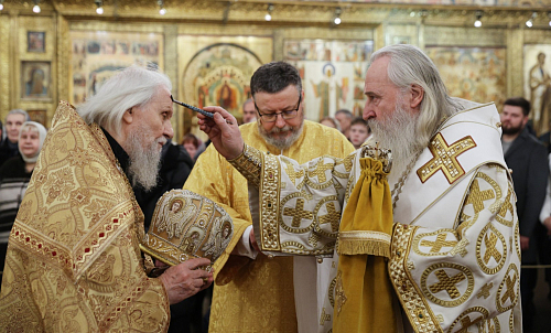 Его Высокопреосвященству сослужили: секретарь Патриарха Московского и всея Руси по г. Москве протопресвитер Владимир Диваков, ризничий Патриаршего Успенского собора и храмов Московского Кремля, настоятель Патриаршего подворья храмов в Зарядье г. Москвы протоиерей Вячеслав Шестаков, духовенство г. Москвы.