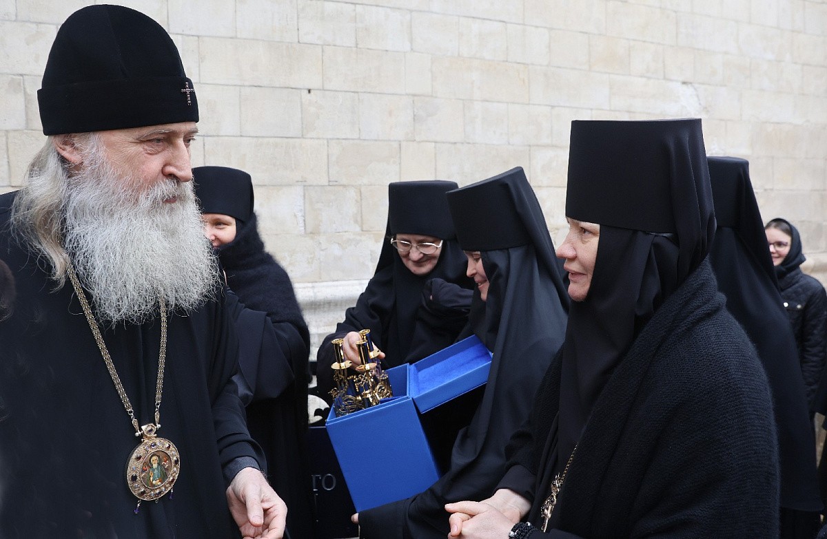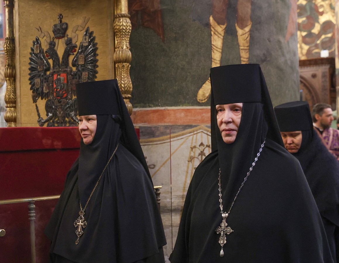 За Литургией молились заместитель председателя Синодального отдела по монастырям и монашеству, настоятельница Зачатьевского ставропигиального монастыря игумения Иулиания (Каледа), настоятельница Богородице-Рождественского ставропигиального монастыря игумения Викторина (Перминова), настоятельница Марфо-Мариинской обители милосердия игумения Елисавета (Позднякова), сестры обителей.