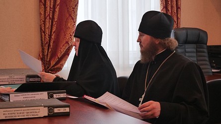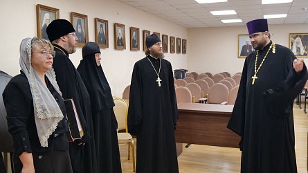 Затем члены комиссии, сопровождаемые протоиереем Михаилом Литвинко, иеромонахом Корнилием (Ивановым) и методистом Екатеринодарской духовной семинарии и Курсов Т.С. Ашурко, посетили семинарию – базовую учебную площадку, являющуюся учебным, методическим и организационным центром Курсов. Комиссия ознакомилась с библиотечным фондом семинарии и проверила документацию курсов на соответствие требованиям «Положения о церковной аккредитации курсов базовой подготовки в области богословия для монашествующих Русской Православной Церкви».