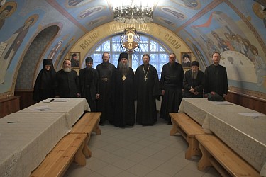 На зачете по дисциплине «Основы Богослужебного Устава и Литургики» присутствовали: благочинный монастыря, магистр богословия иеромонах Прохор (Андрейчук), ответственный за курсы иеромонах Анатолий (Подолян) и преподаватель протоиерей Александр Савельев. Братии было предложено 20 билетов с двумя вопросами. 13 слушателей сдали зачет. После зачета члены выездной комиссии провели встречу со всей братией монастыря. Председатель выездной комиссии архимандрит Феофилакт поздравил слушателей курсов с завершением обучения и напомнил всем о необходимости получения всеми насельниками обители базового богословского образования в рамках действующих курсов. Иеромонах Прохор провёл экскурсию по Успенскому храму и Богом зданным пещерам монастыря. В 1473 году здесь была освящена пещерная церковь Успения Богородицы, выкопанная преподобным Ионой в холме из песчаника. Этот год считается годом основания монастыря. Холм, в котором находятся Успенская церковь и Богом зданные пещеры, называется Святой горой. В 2023 году обитель торжественно отмечала 550-летие. Также члены комиссии посетили Картинную галерею архимандрита Алипия (Воронова).