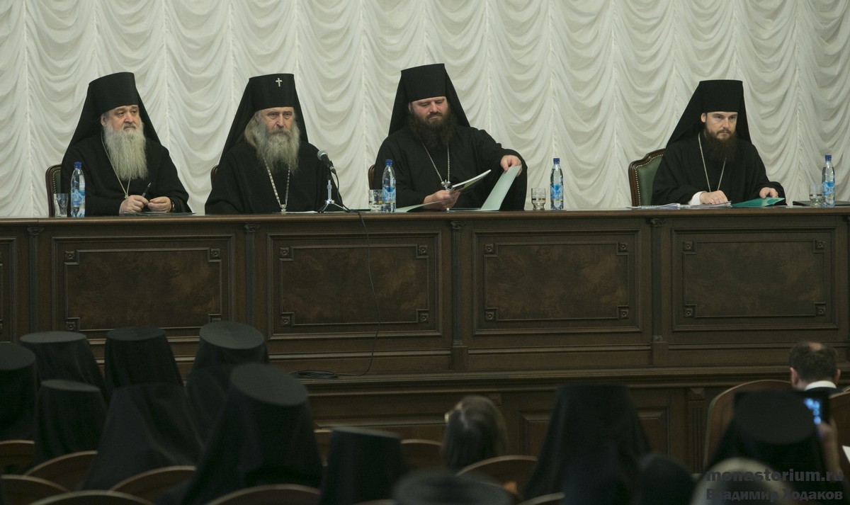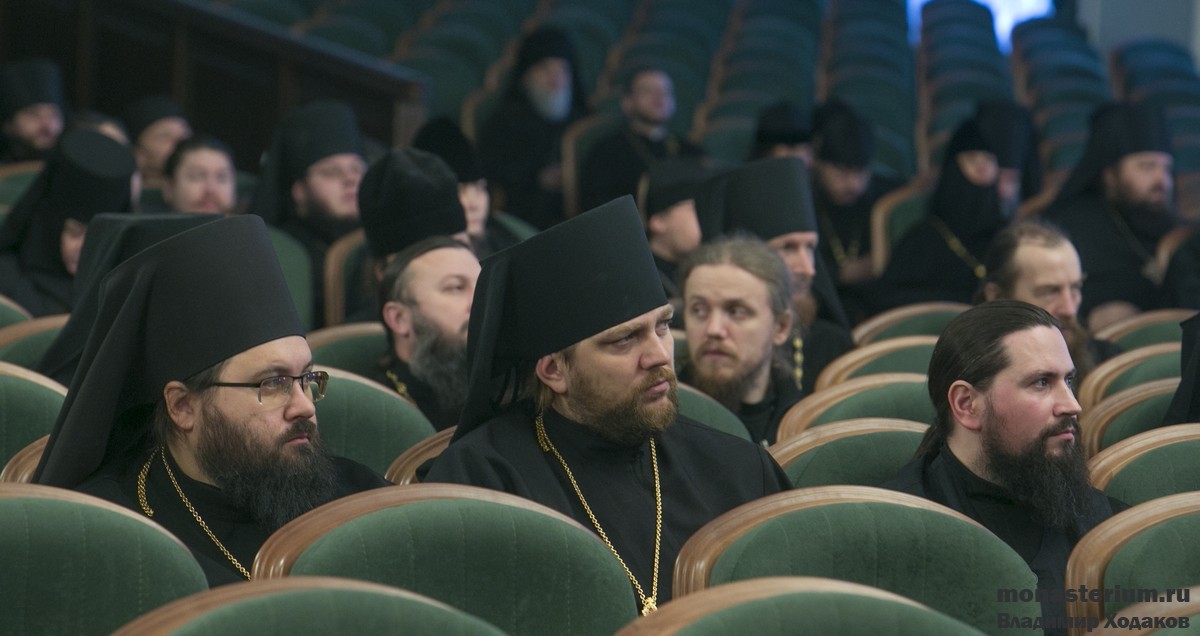 Перед началом собрания в Троицком соборе обители у мощей прп. Сергия Радонежского председатель Синодального отдела по монастырям и монашеству, наместник Троице-Сергиевой лавры архиепископ Сергиево-Посадский Феогност отслужил молебен, за которым молились все участники собрания.