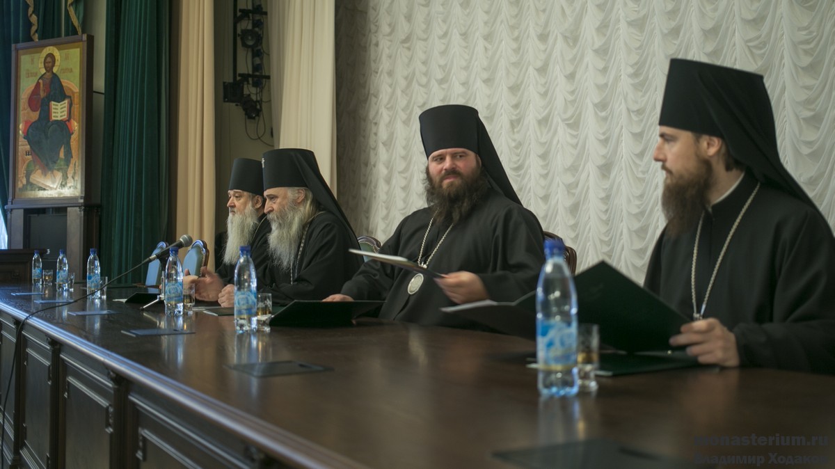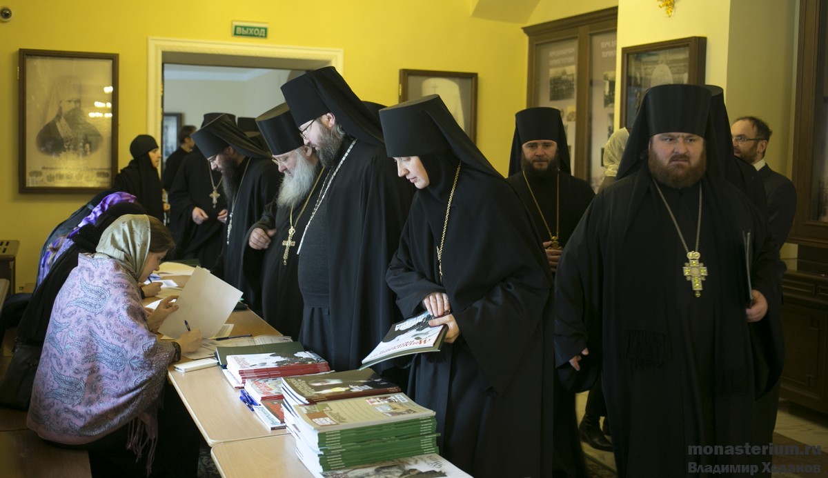 В президиуме присутствовали: председатель Синодального отдела по монастырям и монашеству архиепископ Сергиево-Посадский Феогност; благочинный монастырей Московской епархии епископ Серпуховской Роман; член Коллегии СОММ, наместник Николо-Угрешского ставропигиального мужского монастыря игумен Варфоломей (Петров); председатель Межведомственной комиссии по образованию монашествующих, наместник Высоко-Петровского ставропигиального мужского монастыря игумен Петр (Еремеев).
