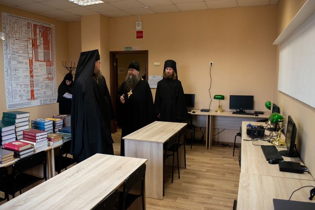 Встреча членов Комиссии с руководством курсов и преподавателями прошла на базовой учебной площадке в Спасо-Преображенском мужском монастыре Мурома. В ходе беседы были рассмотрены: учебный план, календарный график и особенности рабочих программ при изложении материала монашествующим. Члены Комиссии осмотрели учебные помещения, библиотеку и ее фонды, а также материально-техническое обеспечение, в том числе оборудование, необходимое для ведения онлайн-обучения в условиях самоизоляции.