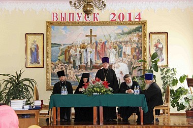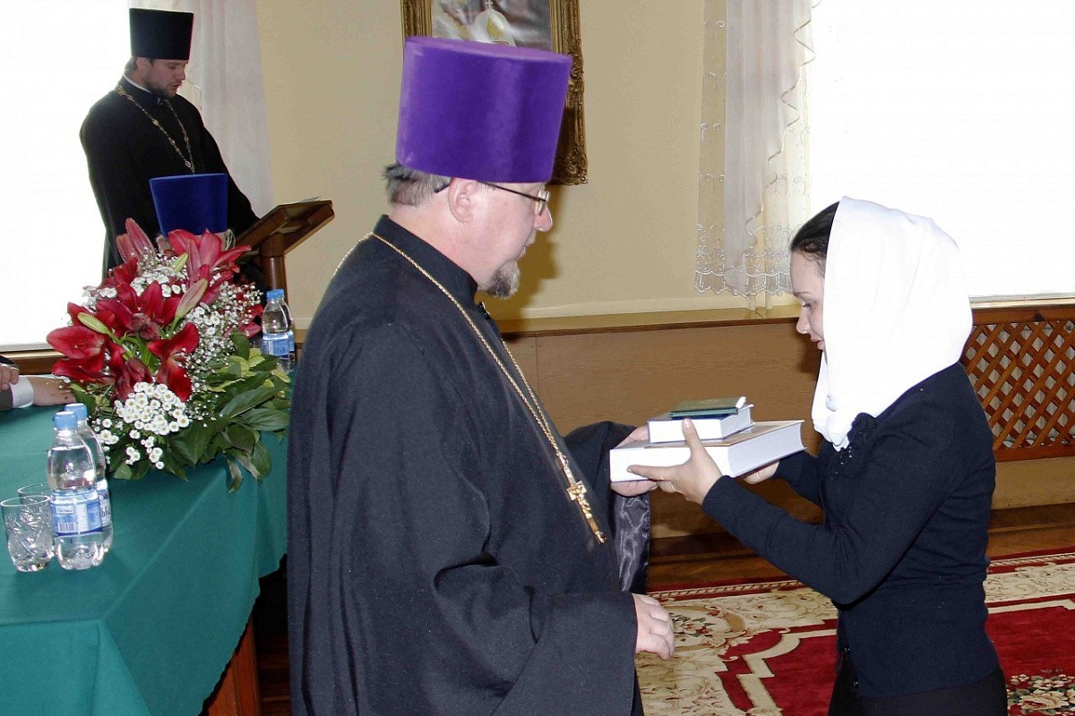 Затем в актовом зале Регентско-катехизаторского духовного училища на выпускном с докладом об успеваемости выпускниц выступил секретарь совета училища иерей Роман Шкадь. По прочтении доклада ректор РКДУ протоиерей Александр Опанасюк вручил дипломы семи выпускницам регентского отделения, в числе которых две насельницы Корецкой обители, и трем выпускницам швейного отделения.