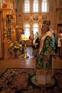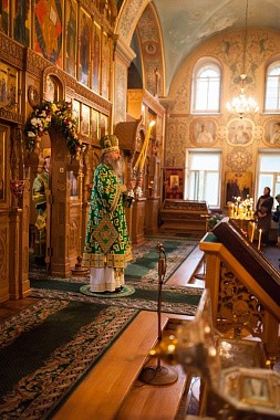 Его Высокопреосвященству сослужили: благочинный Иверского благочиния Москвы протоиерей Геннадий Нефедов; настоятель храма прпп. Сергия и Германа Московского подворья Валаамского монастыря игумен Иосиф (Крюков); насельники подворья в священном сане.