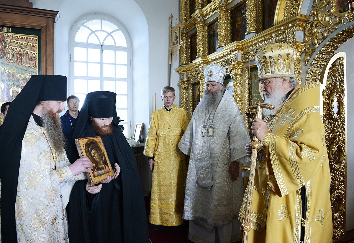 По завершении проповеди Святейший Патриарх Кирилл передал в дар скиту икону преподобного Варнавы Гефсиманского с частицей мощей.
