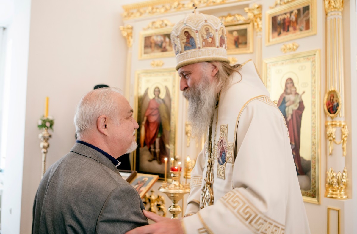 Владыка Феогност поздравил всех молящихся с освящением храма в честь сщмч. Евгения, епископа Херсонесского, совершившегося в древней московской обители, основанной по благословению преподобного Сергия и указу святого благоверного князя Димитрия Донского.