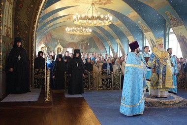 Его Высокопреосвященству сослужили протоиерей Алексий Ладыгин, настоятель храма прп. Евфросинии Московской в Котловке, духовенство монастыря.