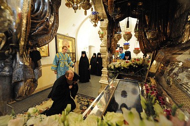 По завершении богослужения настоятельница Покровской обители игумения Феофания приветствовала Высокопреосвященнейшего владыку Савву и преподнесла ему икону святой праведной блаженной Матроны Московской.