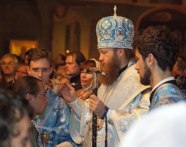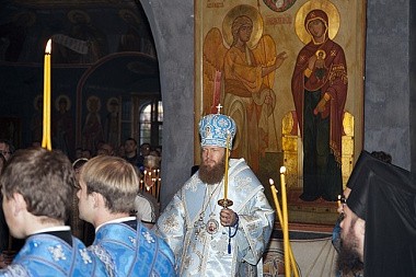 По прочтении Евангелия с пастырским словом к присутствующим обратился Преосвященный Савва. Поздравив всех с престольным праздником обители, Владыка отметил: «Покров Пресвятой Богородицы – это не только реальный видимый плат, покров, но и невидимое предстательство Божией Матери над родом человеческим. Чтобы Она, Царица Небесная, простерла своей невидимый Покров над всеми нами, мы должны исполнять заповеди Ее единоутробного Сына. И бойтесь их не исполнить!»
