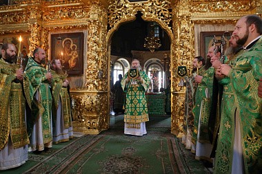 Божественную литургию в Успенском соборе монастыря совершил Председатель Синодального отдела по монастырям и монашеству архиепископ Сергиево-Посадский Феогност.