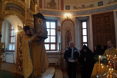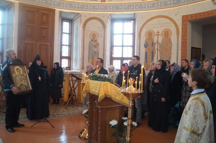 Приняв икону из рук игумении Марии, священник монастыря протоиерей Владислав под пение тропаря и величание святому осенил ею предстоящих. После отпуста все прихожане имели возможность приложиться к переданной в дар обители иконе и получить на молитвенную память акафист и образок святого.