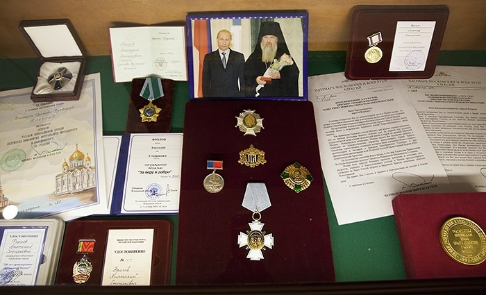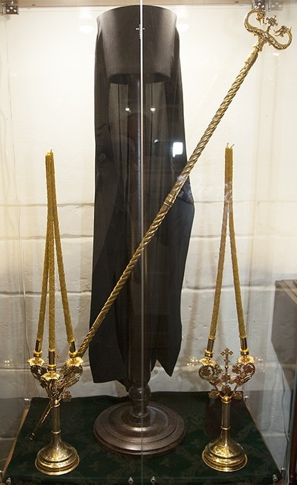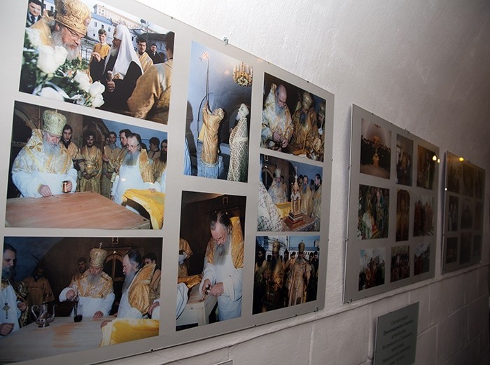 Затем владыки, братия обители направились в храм-усыпальницу, где ознакомились с представленной выставкой, посвященной памяти владыки Алексия. В рамках выставки экспонируются личные вещи владыки Алексия, его дипломы и награды. Одна из них – за строительство Храма Христа Спасителя. На экспозиции представлены фотографии разных лет и важные события в жизни Новоспасского монастыря. Все пришедшие также смогли увидеть дикирий, трикирий, клобук почившего иерарха.