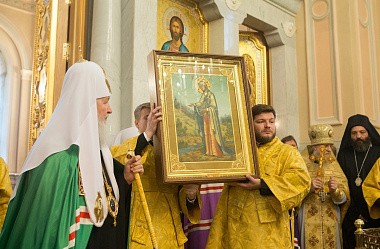По окнчании Литургии Святейшего Патриарха приветствовала настоятельница Иоанно-Предтеченского монастыря игумения Афанасия (Грошева), которая преподнесла Его Святейшеству образ небесного покровителя обители святого Иоанна Предтечи.
