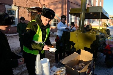 По благословению наместника Донского монастыря игумена Парамона (Голубки) по окончании утренней Литургии все, кто пришел помолиться в обитель, могли бесплатно отведать солдатской каши из военной полевой кухни, выпить горячего чая с булками и печеньем.