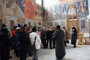 Перед началом концерта сестры монастыря провели для ребят и их преподавателей небольшую экскурсию, познакомившую их с житием преподобных Кирилла и Марии, родителей преподобного Сергия, Православной верой и историей Покровского Хотькова монастыря.