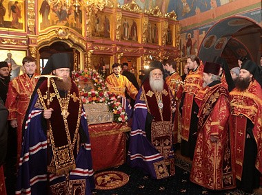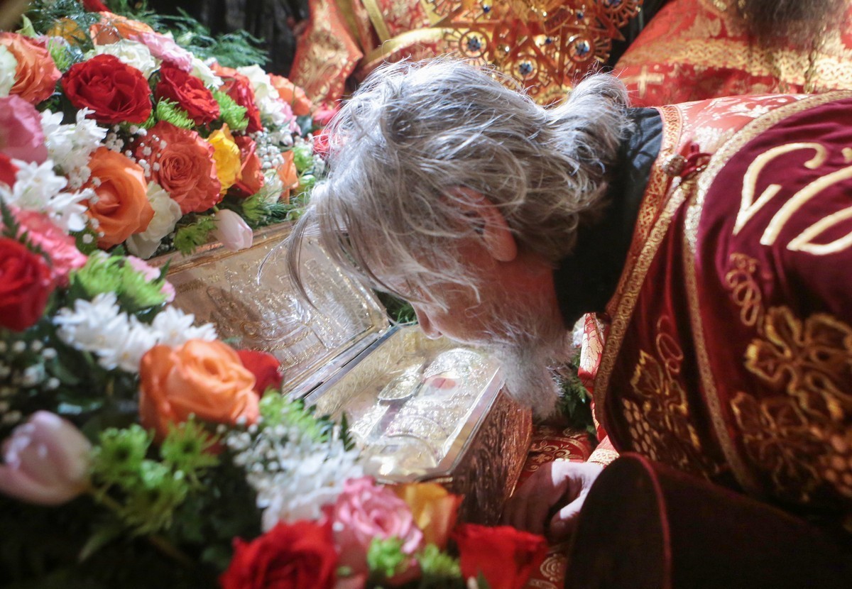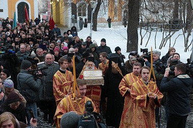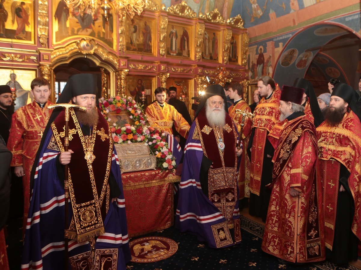 Иерархи осенили ковчегом многочисленных паломников, после чего он был торжественно внесен в монастырь. Под звуки барабанной дроби в исполнении кадетов-барабанщиков процессия двинулась к вратам храма. У входа в храмовую галерею архипастыри осенили ковчегом всю площадь, наполненную богомольцами. Затем святыня была внесена в храм Покрова Божией Матери, где сразу же начался молебен.