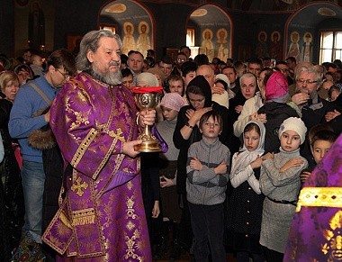 Перед Причастием иеромонах Серафим (Амельченков), секретарь первого заместителя управляющего делами Московской Патриархии, произнес проповедь, посвященную Крестопоклонной неделе и тому, что каждый человек несет свой крест и в этой жизни терпит скорби: «Для чего человеку в жизни страдания? Для того, чтобы оставаться Человеком». Свою проповедь он завершил словами о том, что каждый из нас призван к святости: «Плод наш есть святость, а конец – жизнь вечная» (Рим. 6, 22).