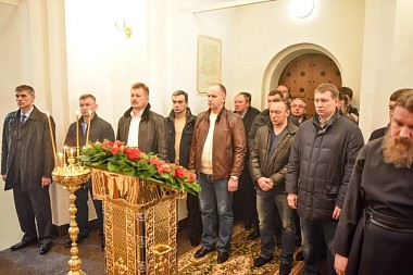 За Литургией молились: начальник ГУ МВД России по экономической безопасности и противодействию коррупции по г. Москве генерал-майор полиции С.А. Солопов с сотрудниками управления; М.И. Колесник, заместитель начальника тыла ГУ МВД по г. Москве; А.А. Добашин, руководитель корпорации ООО «ПСФ КРОСТ».